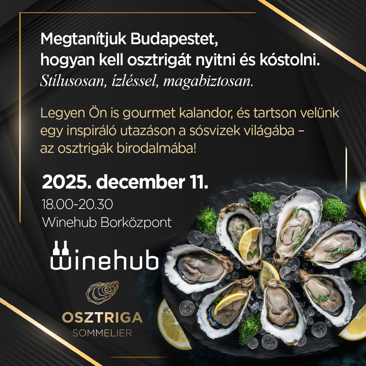 Gasztrokóstoló – 12 különböző osztrigával és 6 fajta borral, illetve pezsgővel.